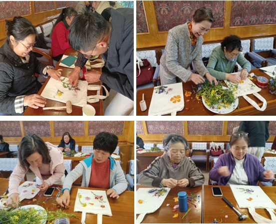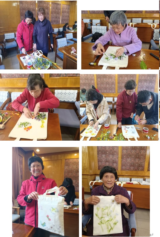 活动现场,指导老师深入浅出地讲解了拓染这一非遗技艺的历史渊源与制作要领。从鲜花的预处理、布袋的准备、图案的设计到敲染的力度掌控,大家认真聆听,细致学习。  随后,退休姐妹们手持工具,沉浸于各自的创作之中。花瓣、叶片在木槌的轻轻敲击下,将自然的纹理与色彩栩栩如生地“拓”印在布袋之上。指尖翻飞间,一幅幅独具匠心、充满自然意趣的拓染作品缓缓诞生。大家彼此交流心得,分享生活趣事,现场欢声笑语不断,其乐融融。
